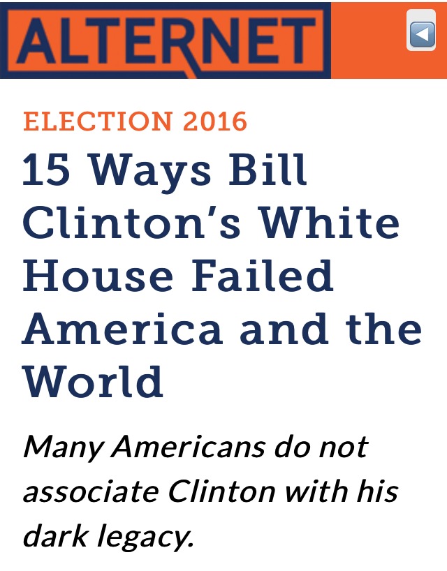 I for one am ready for that real change and have been since ‘92 when we had the opportunity to elect Jerry Brown instead of Bill Clinton who gave us wall street deregulation that crashed the economy in 08 while he also rigged the system against the poor and middle class, deregulated the media so that the establishment voices could drown out all others, Pushed for the free trade agreements that have led to the outsourcing of tens of millions of good paying jobs to slave labor countries not only crushing the middle class, but stagnating wages of those still with jobs and crushing the labor movement. He pushed for and got policies that crushed the poor and communities of color with an escalation of the war on drugs, elimination of welfare as we know it, privatization of prisons and mass incarceration and a draconian crime bill that not only put mostly poor people into prison but then saw to it that they were adversely affected forever once they got out assuring that most would be unable to rebuild their lives and end up back in prison. But that’s not how the establishment tells any of it and thusly not how most people remember it. People remember the short term prosperity, but none of the long term consequences. Then they give his wife a false legacy to run on.